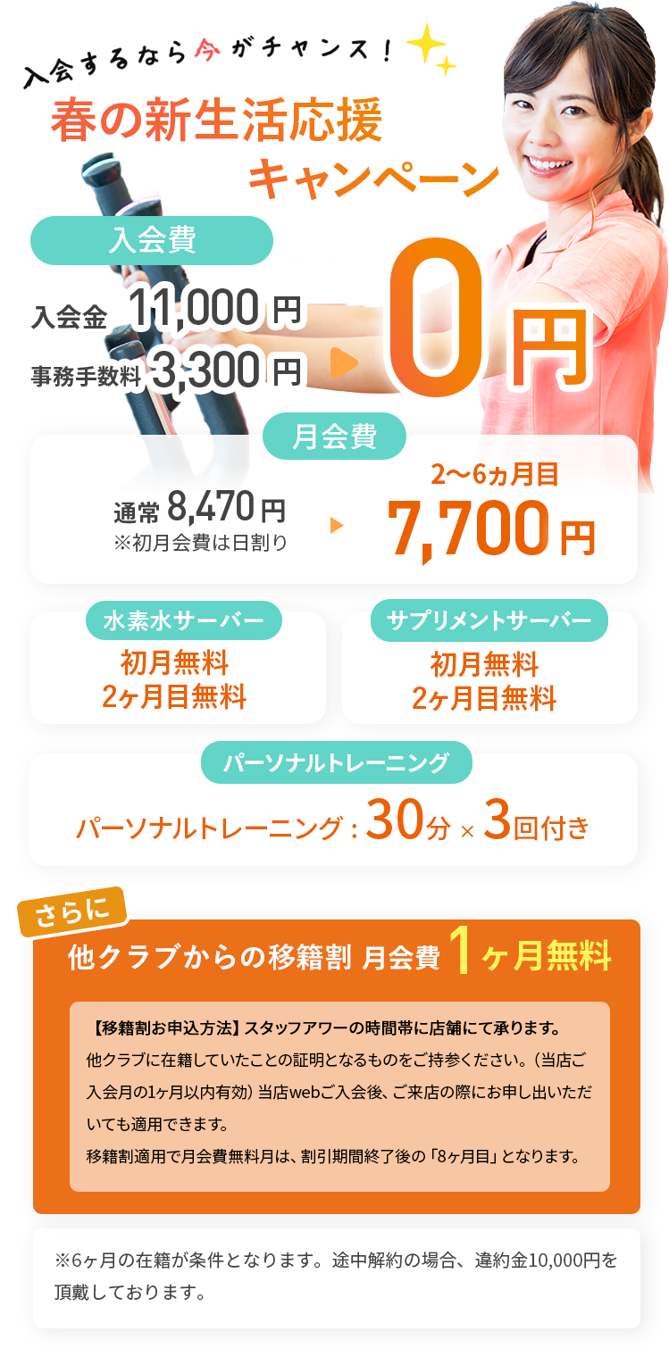 - 入会初月は日割り計算、2ヶ月目は会費無料、3ヶ月目〜7ヶ月目は月額6,600円(税込)でご利用いただけるお得なキャンペーンです。さらに、水素水サーバーとサプリサーバーが初月・2ヶ月目無料でご利用いただけます。